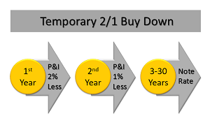 2-1 Buy Down - 2.pngA temporary buydown is fixed rate mortgage that the seller has prepaid interest at closing to lower the payments for a number of years.  The borrower must qualify at the note rate but gets the benefit of lower payments for the early years.